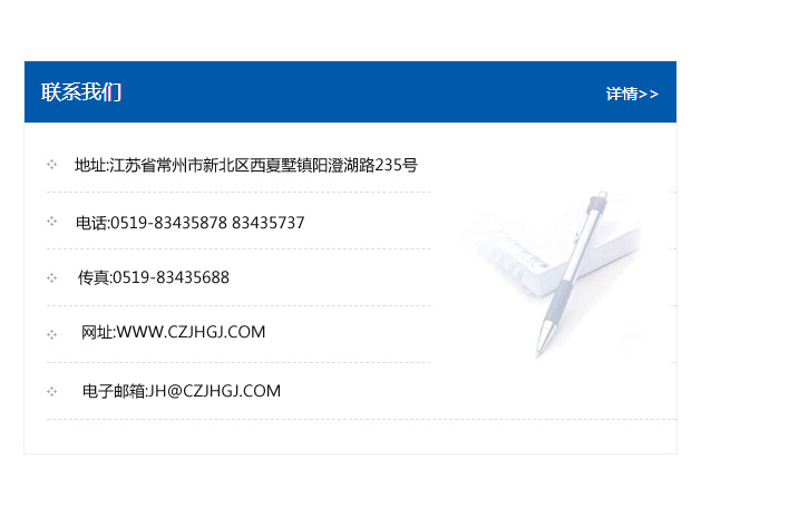 地址:常州市新北區友邦商務大廈1幢16、17層  電話:0519-85101652  傳真:0519-85112595  郵編:213022  網址:www_cz-jiayue_cn.bjsenlong.com  郵箱:xiajifengaa@163.com